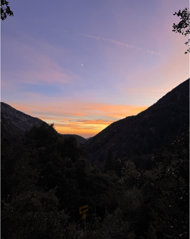 The Jeep Wrangler rattles as it drives up the gravelly, winding, mountain roads of Mount Baldy. Cold air from the open window turns the tips of our noses red and plays with our hair as sunlight peeks through the large pine trees surrounding the car on both sides. Each sharp turn brings us closer to a clearing in the horizon. As the scent of pine and gas fuse with the crisp mountain air, we sing along to the music blasting out of the car’s speakers. Zach Bryan sings “How lucky are we? It’s been a hell of a week, but you’re all grown now…” as we race higher and higher up the mountain in a desperate attempt to catch the sun before it sets. There’s laughter—loud and uncontrollable, the kind that comes from inside jokes you can’t remember who came up with. We notice the road is empty, so we open the sunroof and take turns sticking our heads out of it. It’s reckless, stupid even, but we’ve never felt more alive or free. As the weight of our responsibilities and stress fade into the distance, we feel untouchable. I look at my friends before becoming aware of my heart beating loudly in my chest–not just from the adrenaline of the drive, but from fear. This moment won’t last forever. This time next year I won’t be with the girls I have known since we were seven years old. The road curves once again and the view after the turn renders us speechless. Between two mountain peaks, the sunset illuminates the sky with vibrant yellow, orange, pink, and purple light. We pull over on the side of the dirt road, rush out of the car, shoes crunching against the rocks and dry leaves scattered over the narrow, hidden path as we run up it, ignoring the “private property” sign in our rush. High above the trees, the sunset captivates us. Sitting in a messy line with our shoulders pressed together, we watch the sun dip behind the mountains. No one speaks. I unconsciously hold my breath in an attempt to make time stretch just a little longer. Glancing over at my friends, their faces glowing in the golden hour light, I pull out my phone to capture the ethereal sunset. I want to remember this moment forever, bottle what I feel, and hold onto it when we inevitably become too busy to talk every day. The moon peeks out from behind the clouds–a reminder that it is almost time to go, but none of us move. We know the drive down will feel different–quieter, colder, more real. So, for now, we savor the colors that linger in the sky before darkness envelops us.